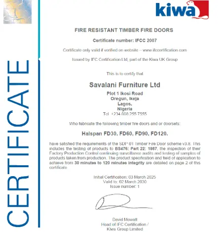We are one of very few manufacturers in Nigeria that has certification to produce fire rated doors